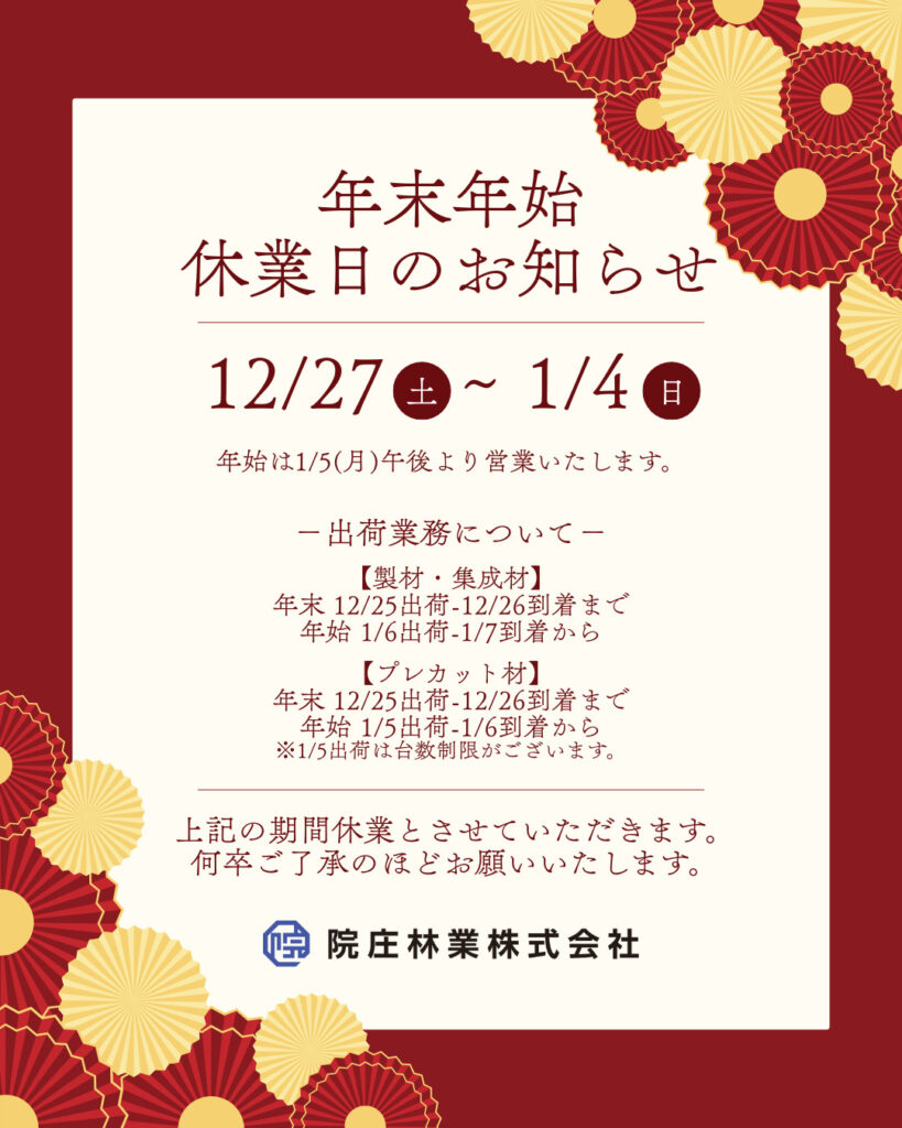 今年も大変お世話になりました。年末年始は上記の期間お休みとなります。来年もどうぞよろしくお願いいたします。