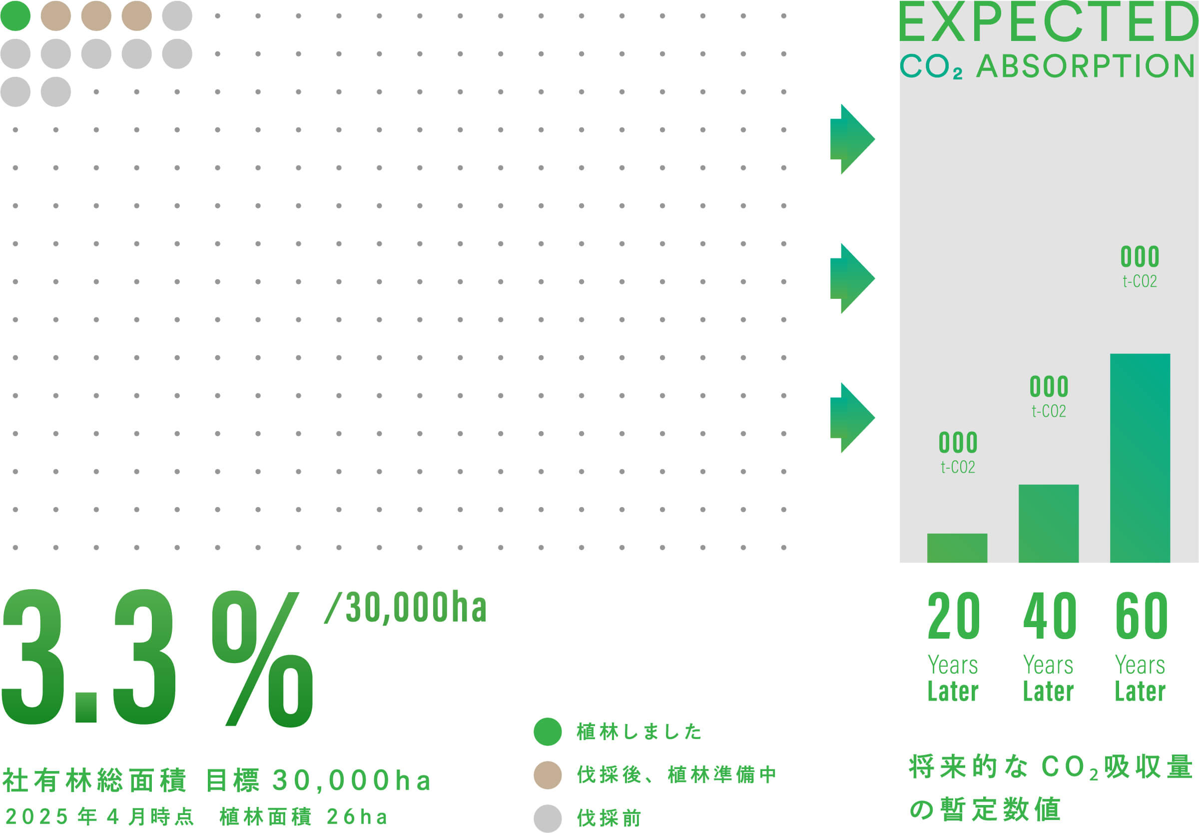 植林の目標面積は30,000ha。ここでは、現状の植林面積と、植林した木々が成長したらどのくらいCO₂を吸収するかという暫定数値を示しています。
