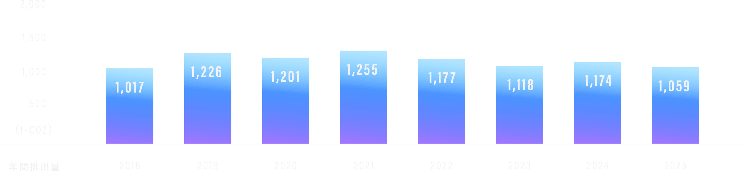 下のグラフは、院庄林業の全ての企業活動における温室効果ガスの年間排出量を時系列で示したものです。
