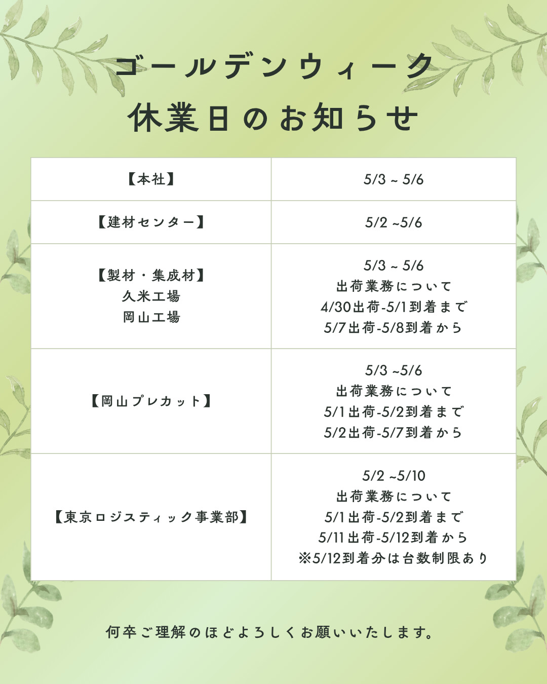 GW 休業のお知らせ 2026.04.27 トピックス未分類 GWお知らせゴールデンウィーク 誠に勝手ながら、以下の期間を休業とさせていただきます。ご不便をお掛けしますが、何卒ご了承の程お願い申し上げます。
