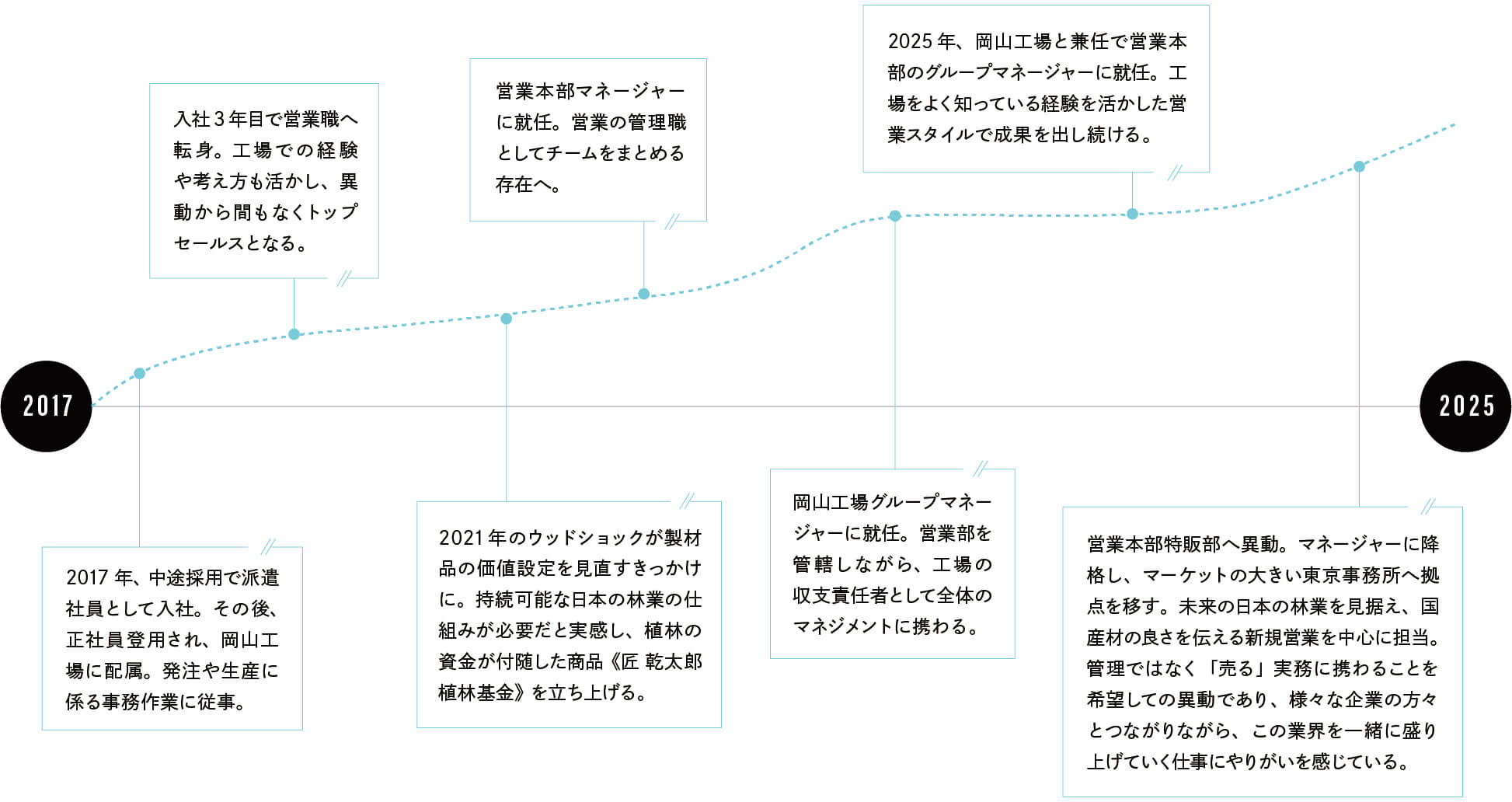 部署や工場の垣根を超え、社内をまとめ、対外的な役割としては会社の価値を発信する役目も担う。その胸に抱くのは「現場の人が一生懸命に作った木材の価値を正当に評価していただき、これからの林業に貢献したい。」という一念。人と人、会社と顧客をつなぐ若きリーダーだ。