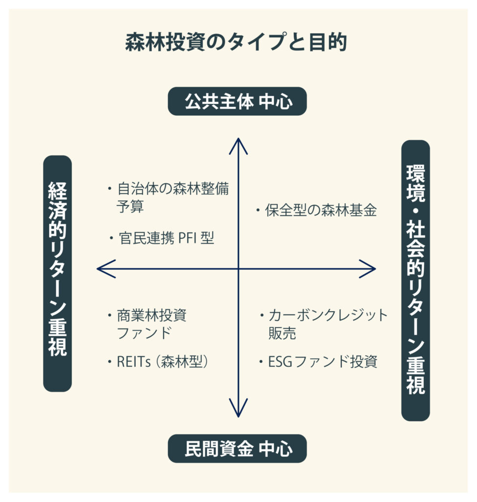 また、「森林投資」と一口に言っても、その目的や資金源の違いによって多様な形があります。