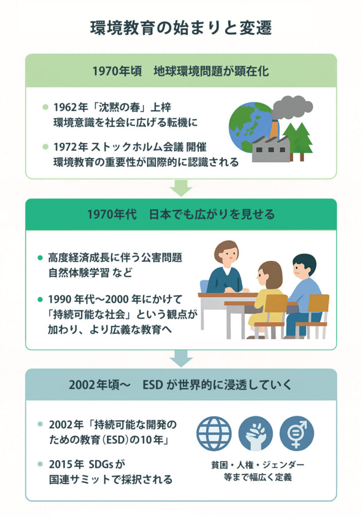 日本では、高度経済成長とともに深刻化した公害問題(四日市ぜんそく、水俣病など)が社会課題となり、1970年代から学校教育の中にも「環境」に関する学びが少しずつ取り入れられていきました。